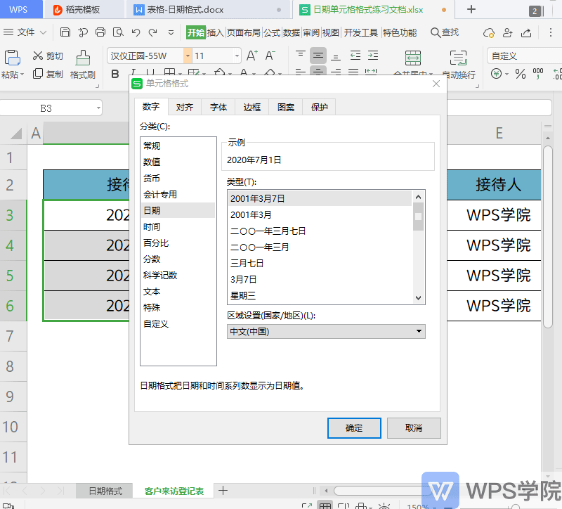 在【单元格格式】→【数字】→【日期】中,WPS已预设多种常用样式: